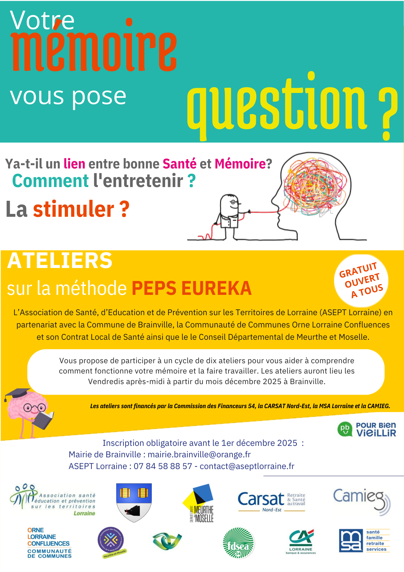 ASEPT Lorraine, en partenariat avec la Commune de Brainville, la Communauté de Communes Orne Lorraine et Confluences et son Contrat Local de Santé, le Conseil Départemental de Meurthe-et-Moselle et les Caisses de retraite, propose un programme d’ateliers mémoire à destination des seniors : le PEP’S Eurêka.