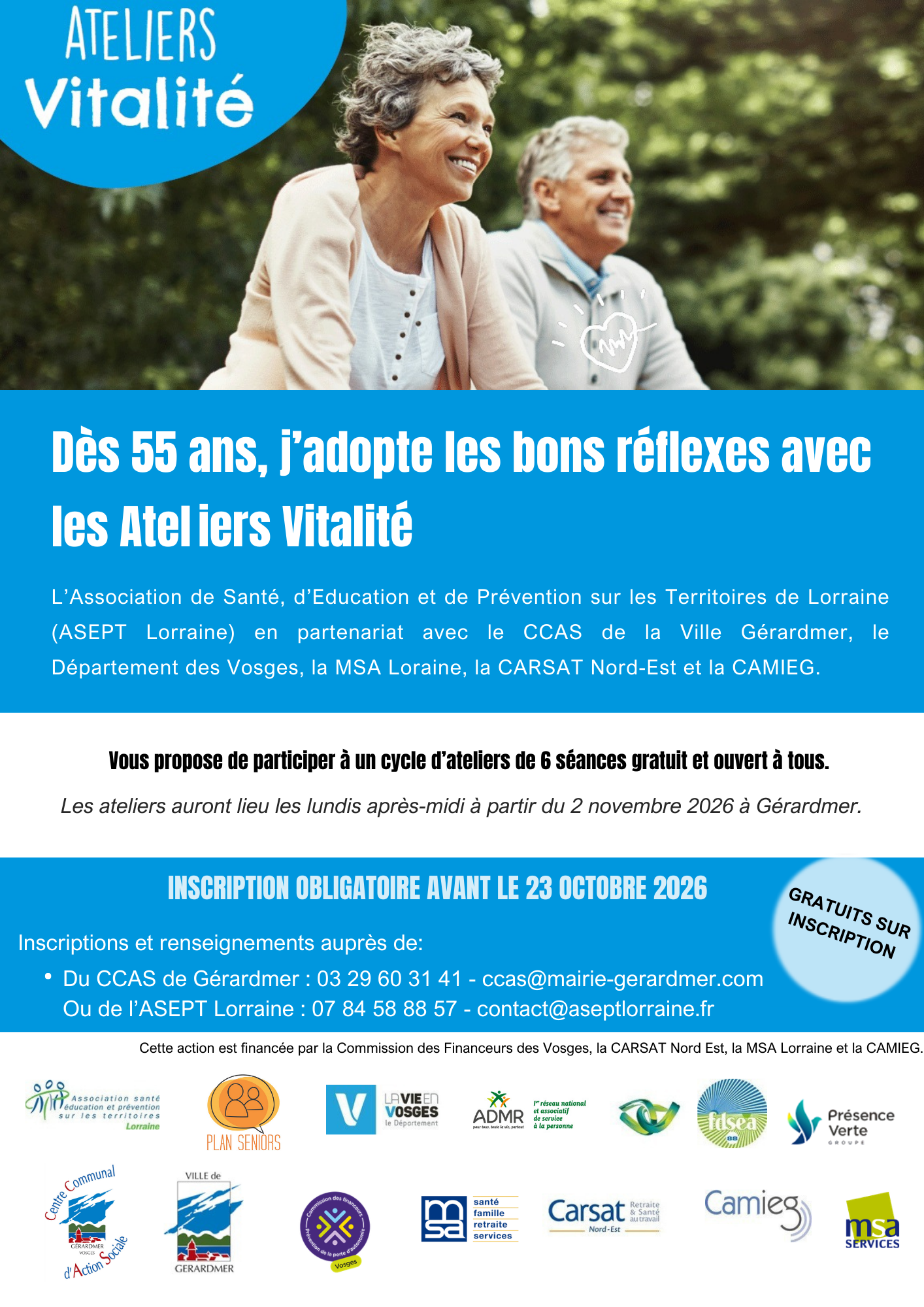 L’Association de Santé, d’Education et de Prévention sur les Territoires de Lorraine (ASEPT Lorraine) en partenariat avec le CCAS de la Ville de Gérardmer, le Conseil Départemental des Vosges, la MSA Lorraine, la CARSAT Nord-Est et la CAMIEG, vous propose un cycle de six ateliers pour vous aider à bien vieillir dans votre tête et dans votre corps.